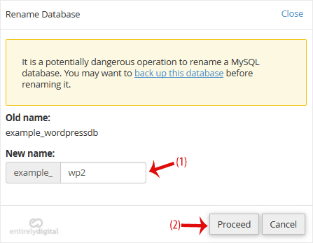 3. Under Current Databases, you can see a list of all your databases. Locate the Database and then click on Rename.