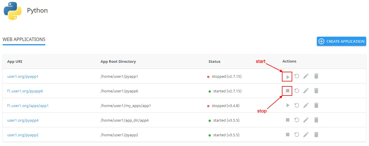 - Actions — allows to migrate, start, restart, stop, edit, and remove a particular application.