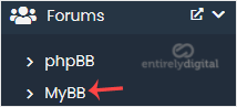 4. On the left side, locate the Forums category. Click on it and then on the MyBB link that appears.